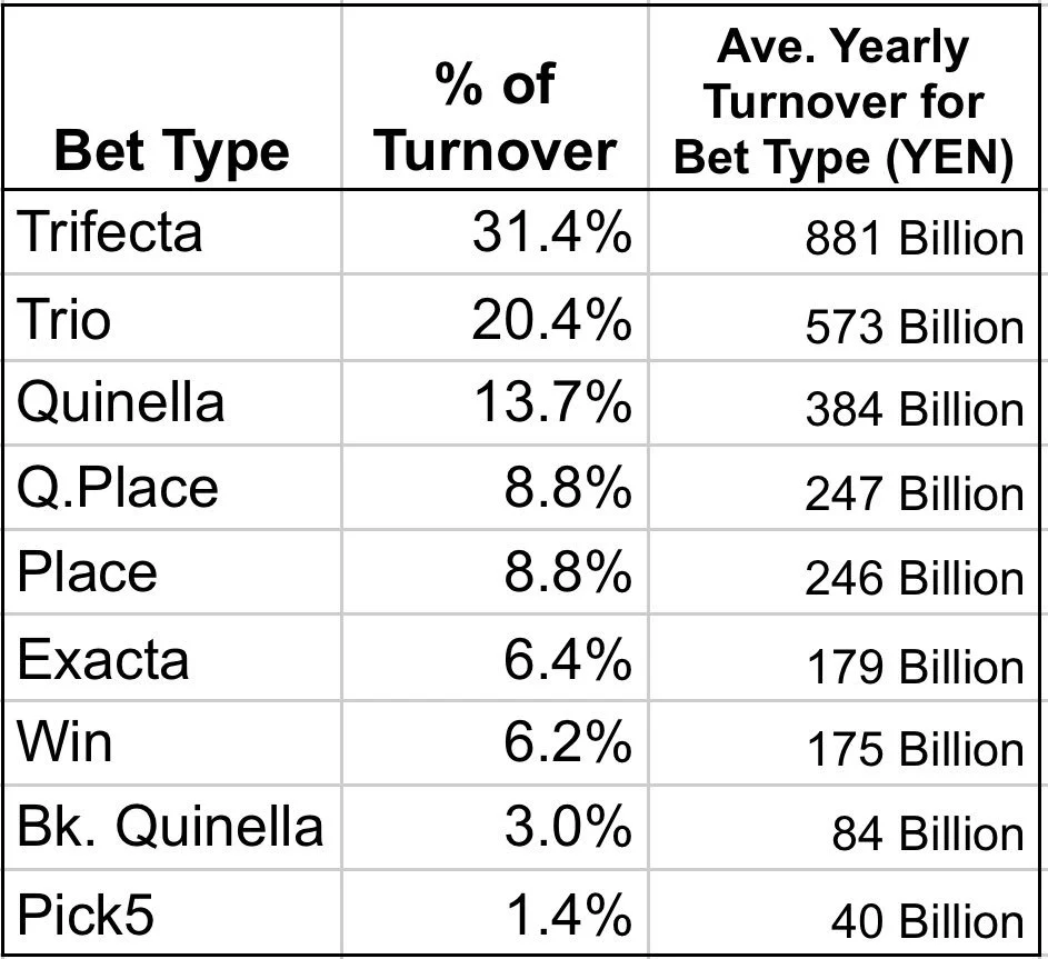 Now whilst it is difficult to directly compare these datasets. The two pie charts show a difference between the two jurisdictions. In Hong Kong punters seem to prefer the Quinella and Quinella Place. Whereas in Japan the punter prefers to wager into the trifecta and trio.
